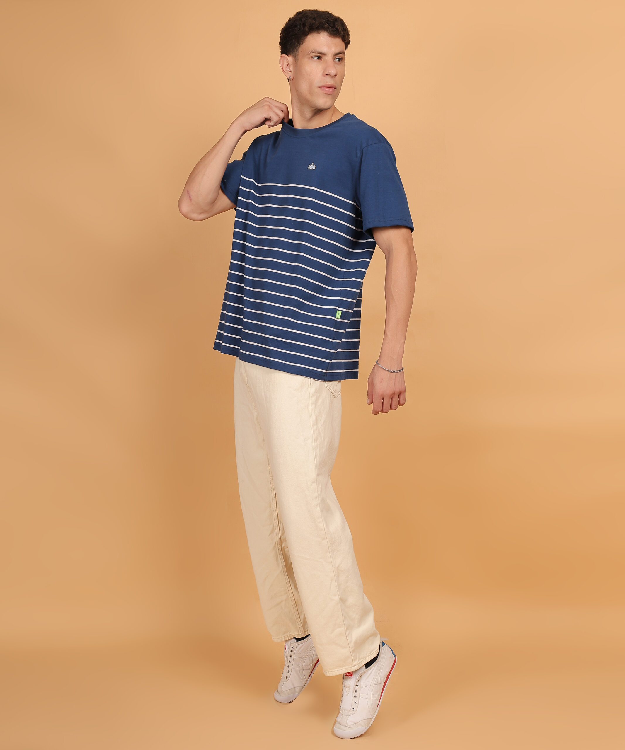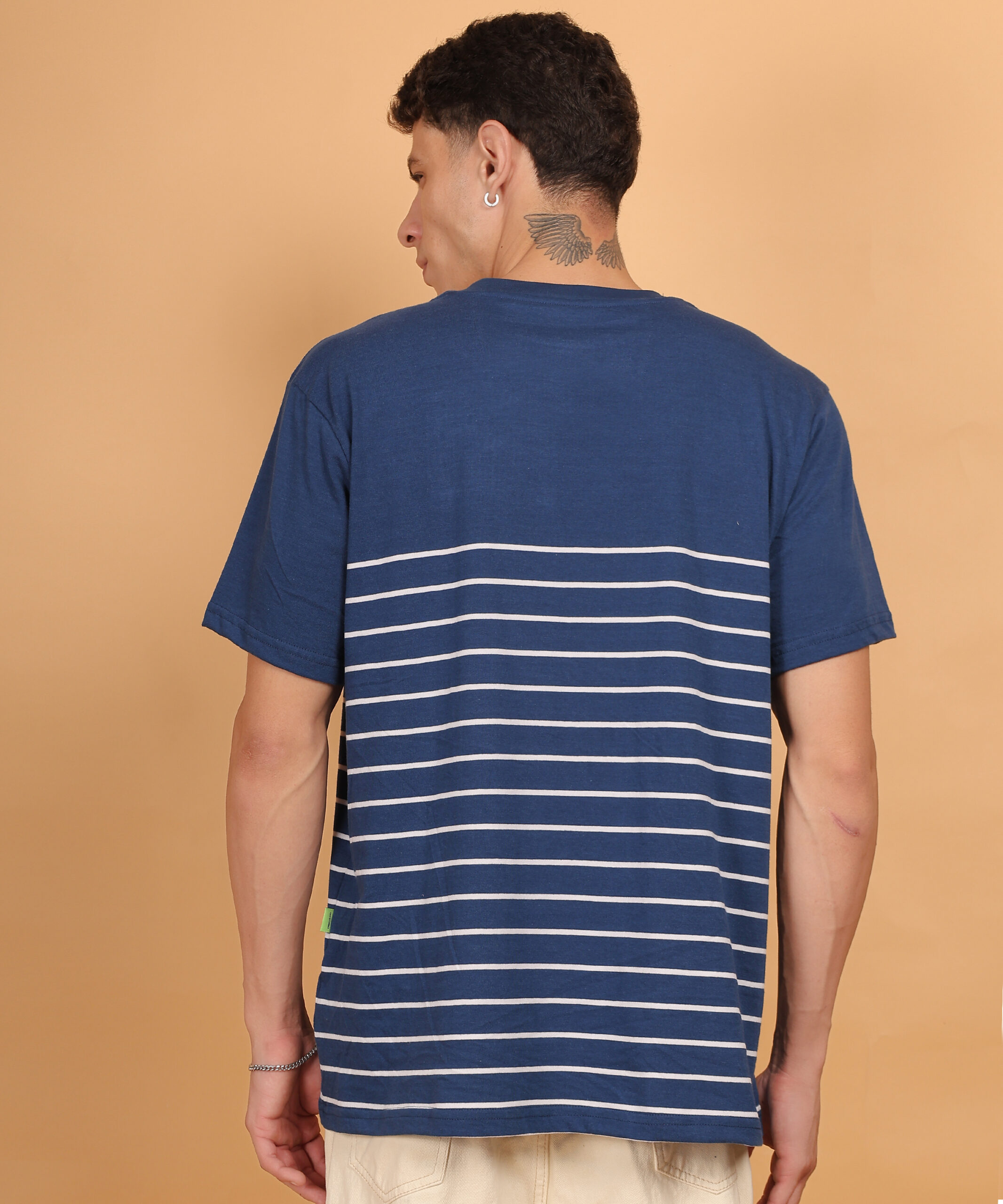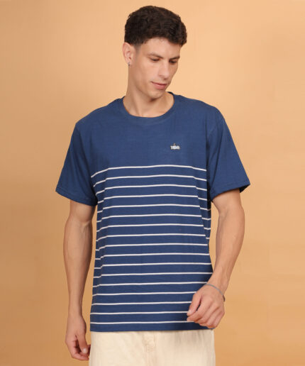 Upgrade your everyday essentials with this Navy Blue & White Striped Round-Neck T-Shirt, made from 100% premium pure cotton (180 GSM). Treated with a bio-silicon wash, it delivers an ultra-soft hand feel and enduring comfort. Perfectly tailored for a clean, timeless look that pairs with anything.